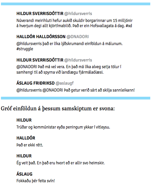 Þetta er hluti af stærra vandamáli. Stærri villu sem tilheyrir þessum gömlu stjórnmálum. Þetta er „ljúgum okkur inn á kjósendur“-stefnan og hún er algjörlega óþolandi. Ef það er eithvað sem Jón Gnarr og Besti flokkurinn hefur kennt okkur þá er það að einlægnin er ofar öllu. Þeir sjálfstæðimenn í borgarmálum sem föttuðu það líka, þeim var bolað út.