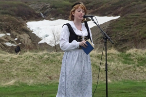 (Mynd: Jóhanna Ösp Einarsdóttir flytur ljóð Ólínu við Bjarkalund, 17. júní 2015. Myndataka: Herdís Erna Matthíasdóttir. Birt á reykholar.is]