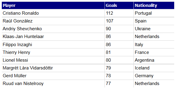 Þetta er Margrét Lára Viðarsdóttir. Fyrst fyrir tæpum mánuði tókst Lionel Messi að smokra sér upp fyrir hana í sjöunda sætið. Ruud van Nistelrooy mun aldrei ná henni.